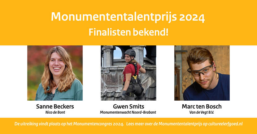 De Monumententalentprijs wordt jaarlijks uitgereikt om jong talent te erkennen en stimuleren binnen de erfgoedsector. Het richt zich op jonge professionals die zich inzetten voor het behoud, beheer, of restauratie van monumenten. De prijs is bedoeld voor mensen onder de 32 jaar die zich onderscheiden met hun kennis, vaardigheden, en passie voor cultureel erfgoed.
