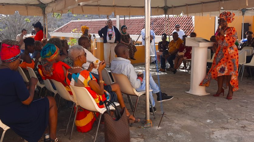 It is Saturday afternoon and on the terrace of plantation-house Knip (Kenepa) there is an unusual flurry of activity. Music and speeches rise up into the air and cascade down the hills. The guests are seated on the tented west terrace. Many of the female guests have made an effort to wear colorful traditional dresses and headdresses. It is a celebration after all.